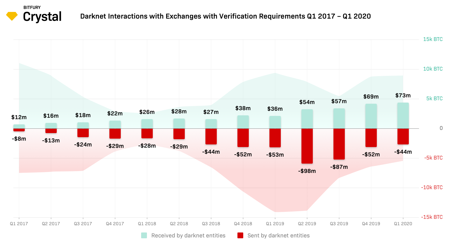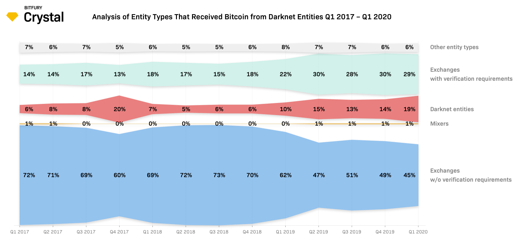 «В первом квартале 2019 года только 1% биткоинов был отправлен на такие услуги – в первом квартале 2020 года он вырос до 20%. Для сравнения: доля биткоинов, отправленных на биржи с требованиями проверки, упала с 24% в 1 квартале 2019 года до 13% в 1 квартале 2020 года. Это, вероятно, является ответом на усиление процессов регулирования и проверки для бирж, что приводит к тому, что владельцы биткоинов даркнета начинают скрывать другие услуги, источник их монет», – сообщается в отчете.