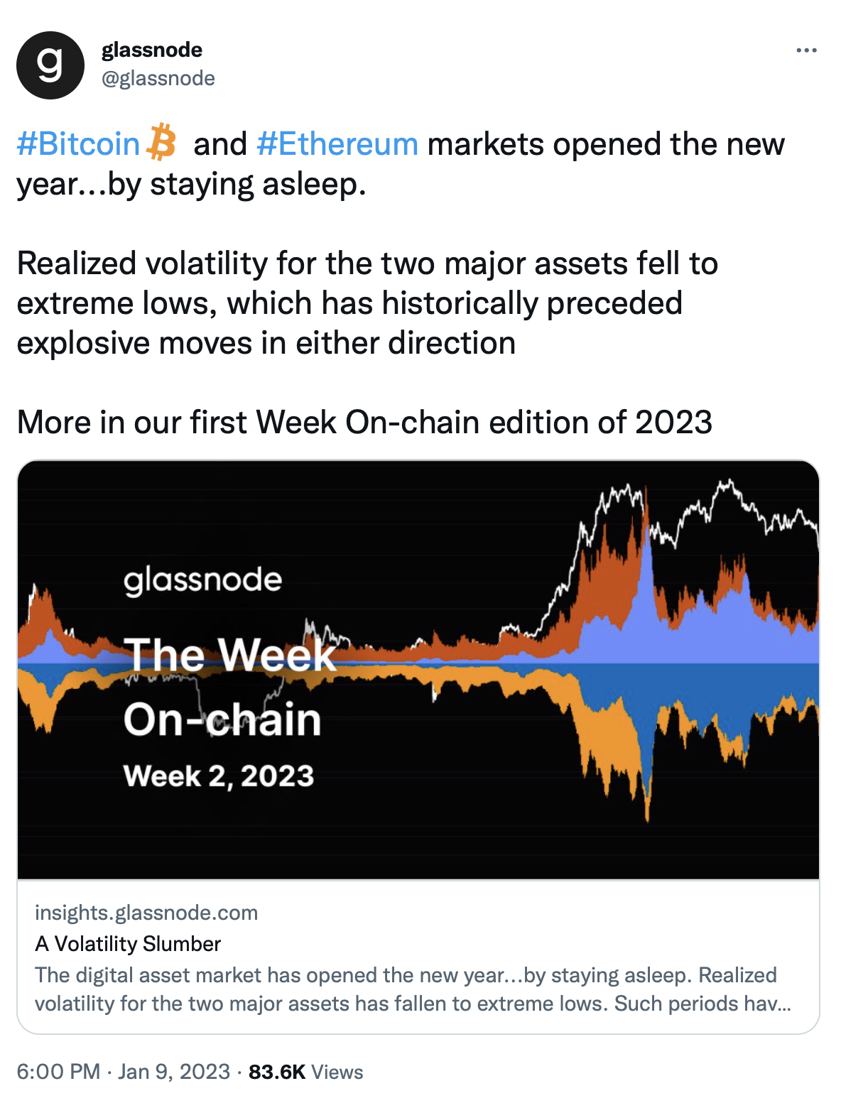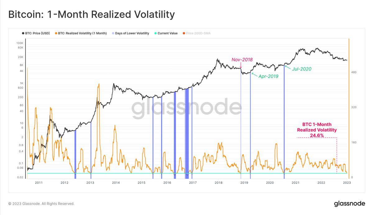 Согласно отчету Glassnode, с момента краха FTX в начале ноября биткоин (BTC) и Ethereum торговались в узком диапазоне и обновили минимумы волатильности текущего цикла. Ранее подобные периоды предшествовали взрывным движениям рынка.