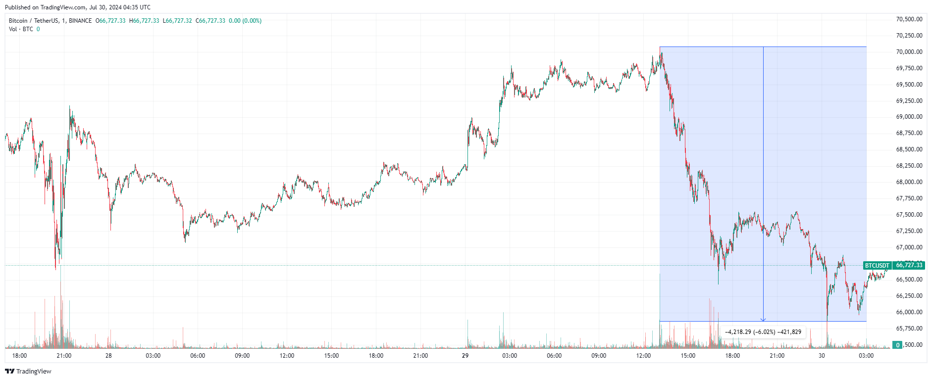 Вечером 29 июля 2024 года биткоину удалось в моменте прорвать уровень $70 000. После криптовалюта вышла в коррекцию, глубина которой превысила 6%. По состоянию на момент написания обзора, биткоин торгуется по $66 727.