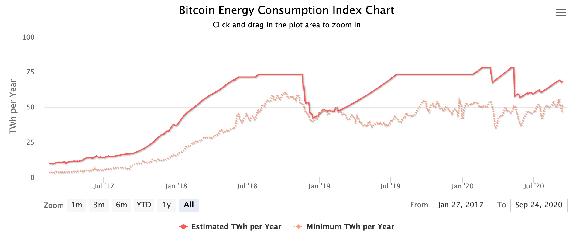 По данным Digiconomist, ресурса, который отслеживает общий объем электроэнергии, потребляемый сетью, на обслуживание и майнинг монеты сейчас тратится 67,927 тераватт в час в год. Это незначительно ниже пика на уровне 68,916 тераватт в час, достигнутого 4 сентября.