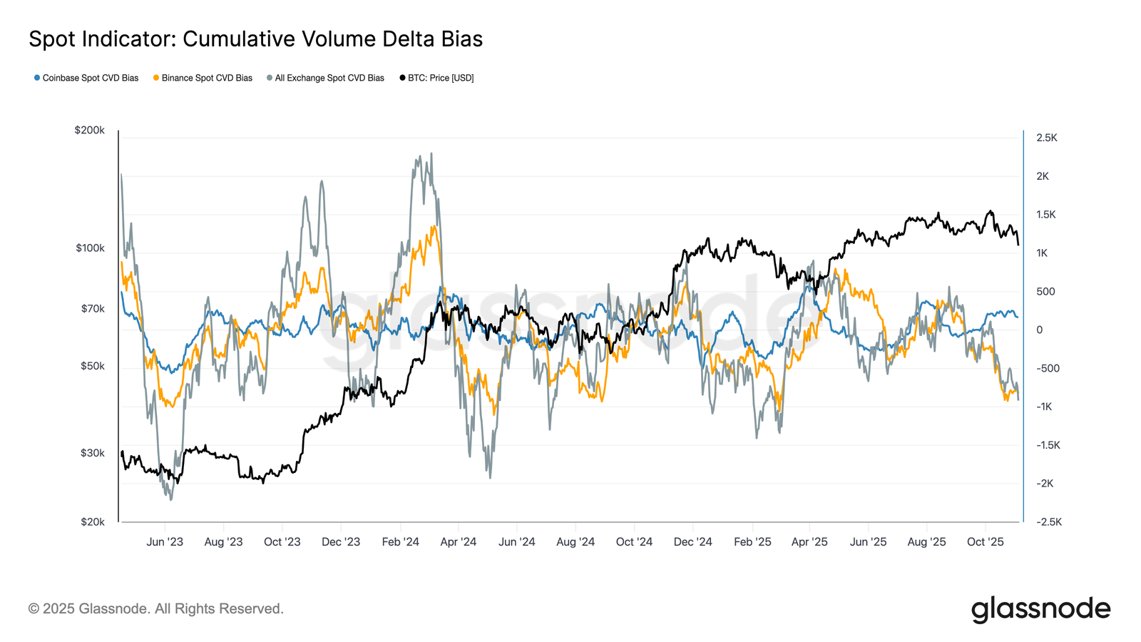 Совокупный объем покупок (CVD) на крупных биржах остается отрицательным, показывая преобладание продавцов. Одновременно падает интерес к фьючерсам: Perpetual Market Directional Premium сократился почти втрое с весны. Рынок фактически остывает.