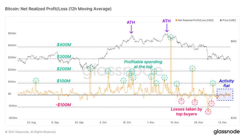 Как утверждают в Glassnode, против рынка сыграл ажиотаж розничных инвесторов. Как видно на графике выше, именно на новичков пришелся первый удар коррекции цены. Достигнув максимума в ноябре, инвесторы стали нести убытки по $50-100 млн в день. Аналитики полагают, что реализация убытков является следствием ажиотажа розничных инвесторов, закупивших криптовалюту на максимуме.