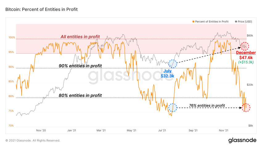 Более 75% адресов в блокчейне биткоина остаются в прибыли вопреки откату цены криптовалюты. К такому выводу пришли аналитики ресурса Glassnode. По мере падения цены биткоина ниже $50 000, порядка 76% адресов в прибыли. Примечательно, что такой же объем адресов был в прибыли и летом этого года, когда цена криптовалюты составляла ~$32 000.