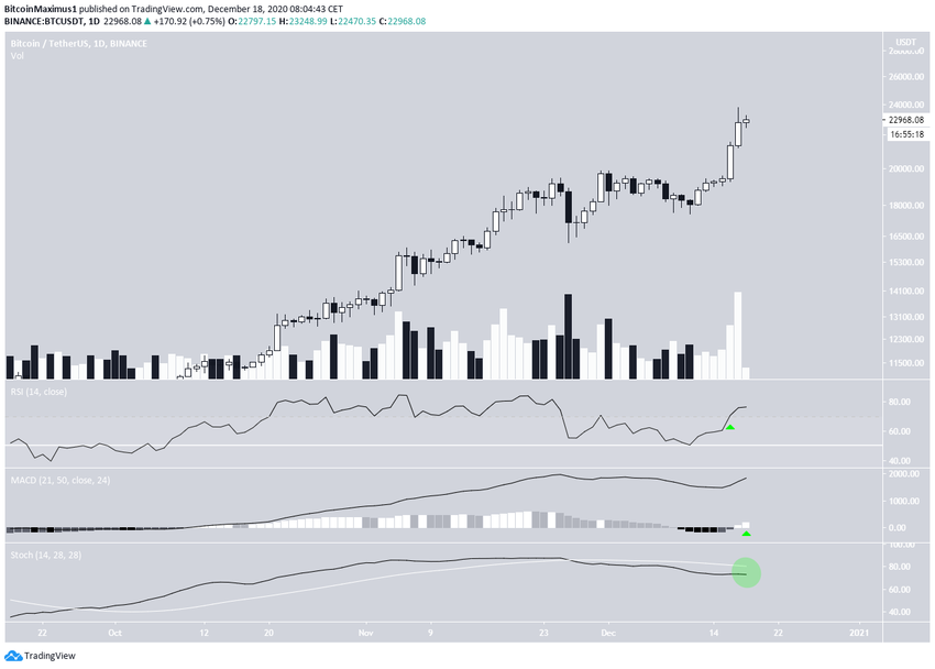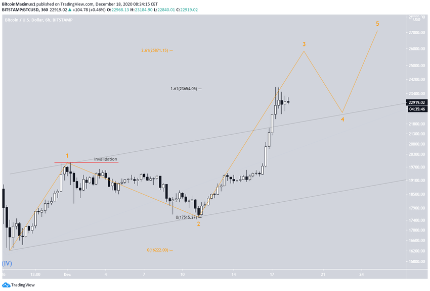 Курс биткоина (BTC) продолжает сохранять боевой настрой после того, как быкам удалось, наконец, взять область сопротивления $19 500. Накануне, 17 декабря цена обновила исторический максимум на $23 800, а затем сформировала небольшой верхний фитиль и немного отступила к $23 000.