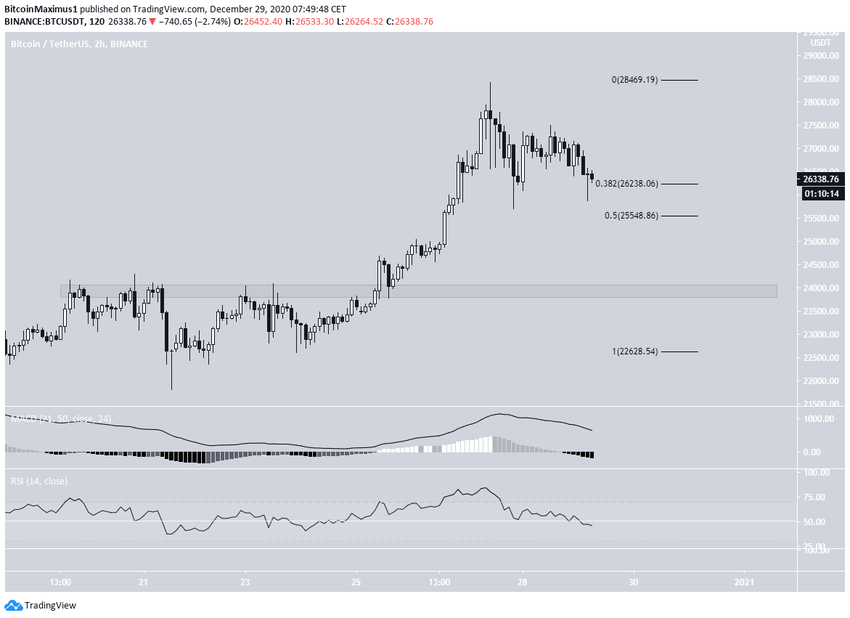 На 2-часовом графике не отмечается никаких сигналов бычьего разворота. Прорыв под эти уровни поддержки может спровоцировать резкую просадку рынка к $24 000.