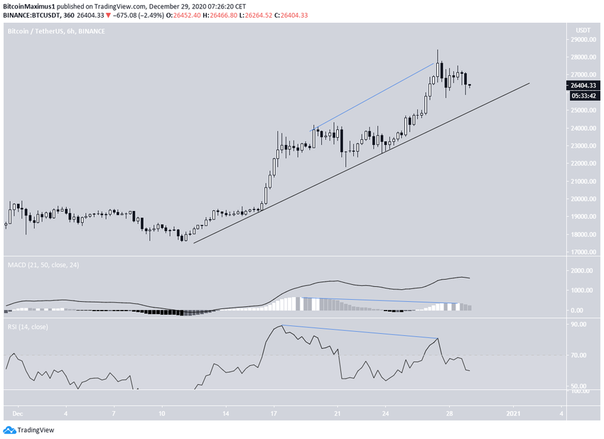 На 6-часовом графике сигналы медвежьей дивергенции выражены более явственно. Они заметны как по RSI, так и по MACD. Кроме того, на этом таймфрейме можно увидеть, что биткоин движется вдоль линии восходящей поддержки, которая сейчас проходит непосредственно над $25 000.