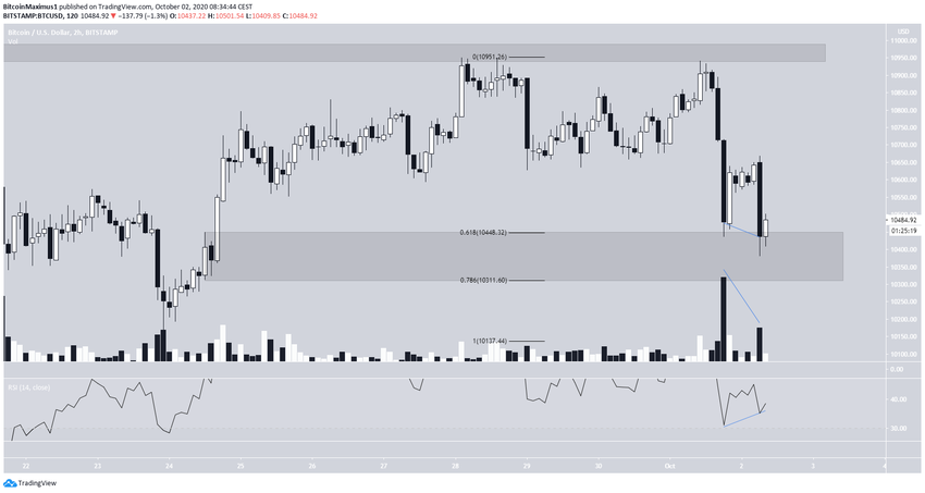 SponsoredПосле появления сигналов медвежьей дивергенции со стороны RSI и MACD, цена резко снизилась, достигнув минимума $10 385. На момент написания статьи криптовалюта торговалась у отметки $10 440.