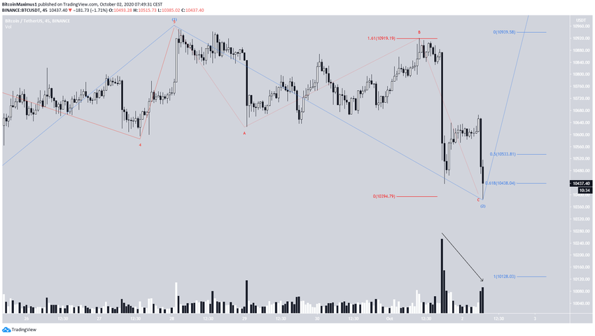 1 октября биткоин коснулся максимума $10 920, сформировав двойную вершину по отношению к цене 28 сентября. Вершина была сформировала вблизи уровня 0,786% коррекции относительно предыдущего снижения, что говорит о высокой вероятности разворота в этой точке.