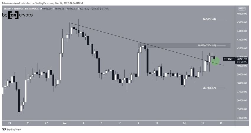 Биткоин (BTC) с 1 марта снижался, двигаясь вдоль линии нисходящего сопротивления. 15 марта цена отскочила от этой линии, сформировав очень длинный верхний фитиль. Такие фитили считаются признаком давления со стороны продавцов.