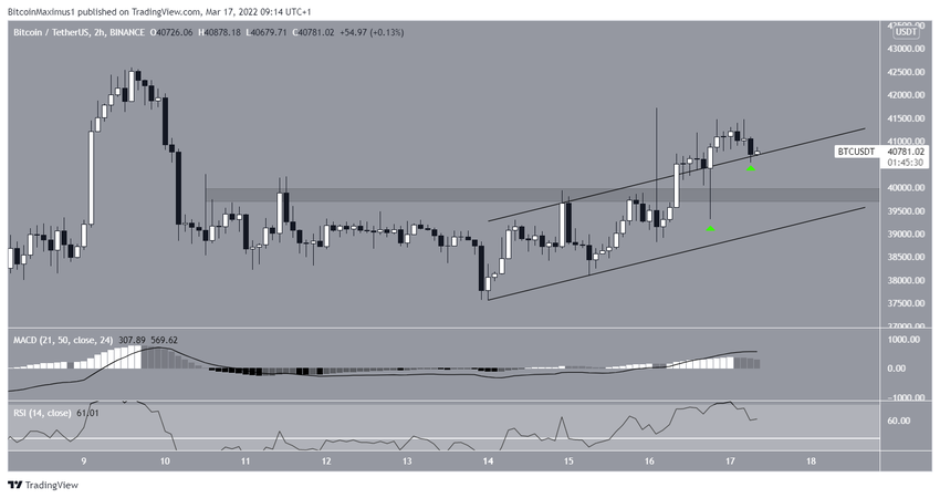 BTC восстановился над областью горизонтальной поддержки $39 830, сформировав при этом длинный нижний фитиль. Кроме того, цена также прорвалась из восходящего параллельного канала и сейчас превращает линию его сопротивления в поддержку (зеленый значок).