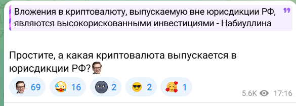 По логике Эльвиры Набиуллиной все децентрализованные криптовалюты, включая биткоин, с точки зрения Банка России, представляют собой угрозу. При этом некие российские монеты — напротив, по ее мнению, несут меньше рисков.