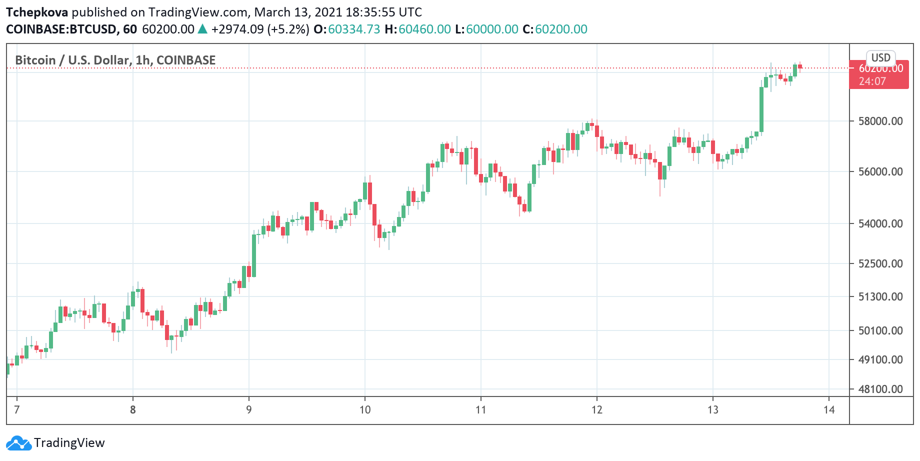 «Новый пакет стимулов в США, Илон Маск, нагнетающий ажиотаж, капитуляция коротких продавцов и низкая ликвидность выходного дня — этот коктейль факторов подбросил биткоин выше отметки $60 000», — заявил старший рыночный аналитик в Oanda Corp, Эл Мойя. «Биткоин снова показал свою силу, и никто не хочет идти против этого тренда».