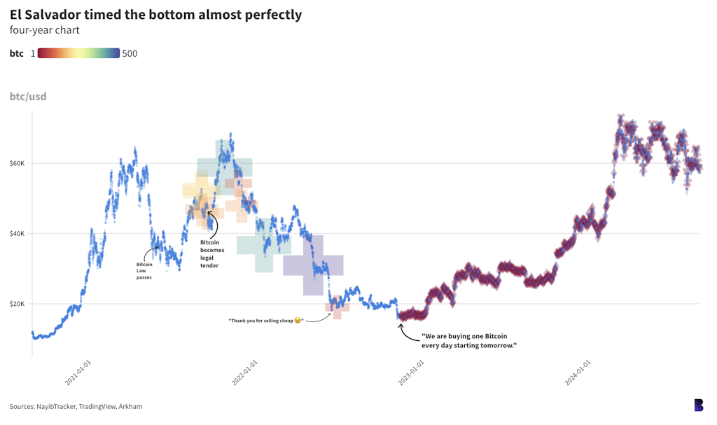 Власти Сальвадора легализовали биткоин за два месяца до обновления криптовалютой локального максимума близ $69 000, после чего монета погрузилась в затяжную криптозиму. Спустя три года после ставки Букеле на BTC монета торгуется всего на 11% дороже.
