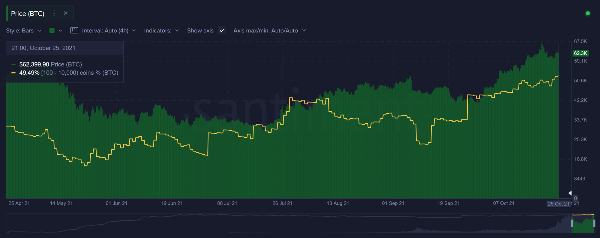 Тем временем увеличились объемы китовых резервов. Согласно Santiment, за последние две недели киты пополнили свои вложения на 0,19% от предложения BTC. Суммарно крупные инвесторы держат 49,49% от общего предложения биткоина, что является наибольшим показателем за восемь лет.