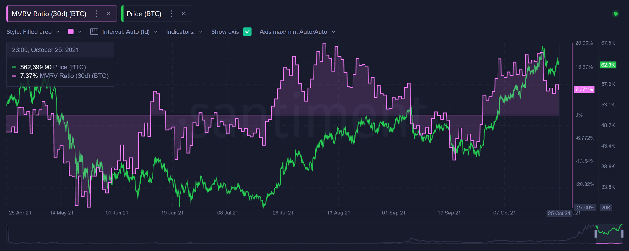 У биткоина еще есть простор для роста даже на отметке выше $60 000. К такому выводу пришли аналитики ресурса Santiment. Согласно 30-дневной метрике соотношения рыночной стоимости к реализованной (30-d MVRV), биткоин находится лишь на половине пути к зоне перекупленности.