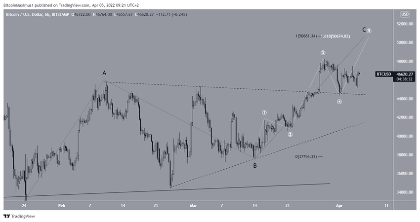 SponsoredНа 2-часовом графике можно ознакомиться с более приближенным подволновым анализом (красный цвет). Согласно его результатам, биткоин находится сейчас в малой подволне 3. Поглощение вчерашнего минимума на $45 214 нейтрализует этот сценарий.