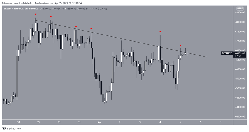 На 2-часовом графике BTC с 28 марта движется вдоль линии нисходящего сопротивления. Цена уже шесть раз предпринимала попытки штурма этой линии (красные значки), а сейчас уже в седьмой раз пытается совершить ее бычий пробой.