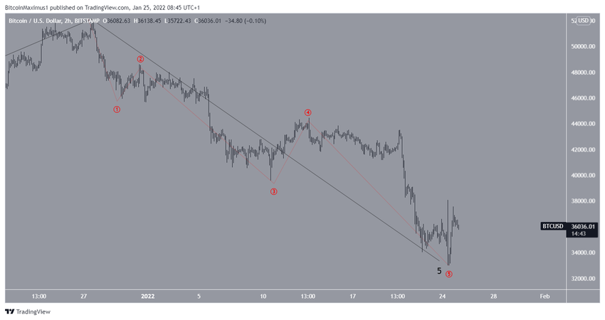 Снижение цены продолжалось до 25 января, когда BTC сформировал локальный минимум на $32 917. После этого цена сразу же отскочила (зеленый значок) и сформировала бычью свечу с очень длинным нижним фитилем. Это традиционно считается признаком давления со стороны покупателей.