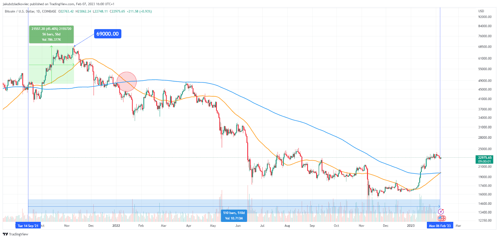 Последний золотой крест на графике биткоина появился 510 дней назад — 14 сентября 2021 года. Через 2 месяца после этого цена биткоина обновила исторический максимум и достигла $69 000.