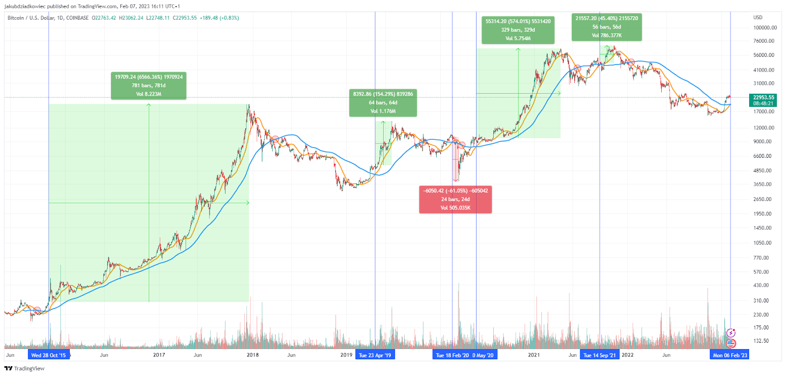 Чтобы спрогнозировать дальнейшее движение цены биткоина, нужно обратиться к историческим данным. Начиная с 2015 года, золотой крест формировался пять раз. Четыре из них привели к значительному росту BTC, а один — к резкому падению.
