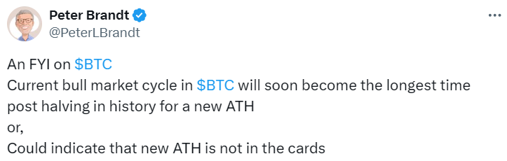 «Текущий бычий цикл на рынке BTC вскоре станет самым продолжительным периодом после халвинга в истории, с точки зрения достижения нового ATH или же такое поведение криптовалюты может указывать на то, что новый ATH не предвидится», — так Питер Брандт описал текущее положение биткоина.