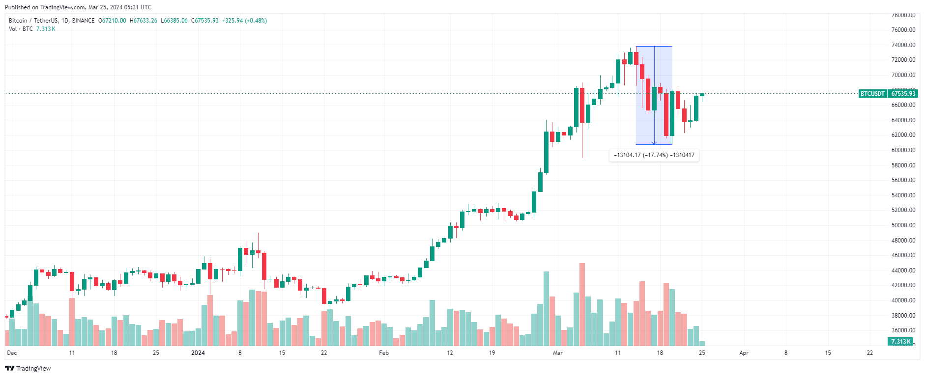 Биткоин начал новую рабочую неделю с восстановления после коррекции, которая началась 14 марта 2024 года — на фоне обновления криптовалютой абсолютного максимума (ATH) стоимости на уровне $73 750. В моменте BTC подешевел более чем на 17%. По состоянию на момент написания обзора, биткоин торгуется по $67 535, что на 8% ниже ATH.