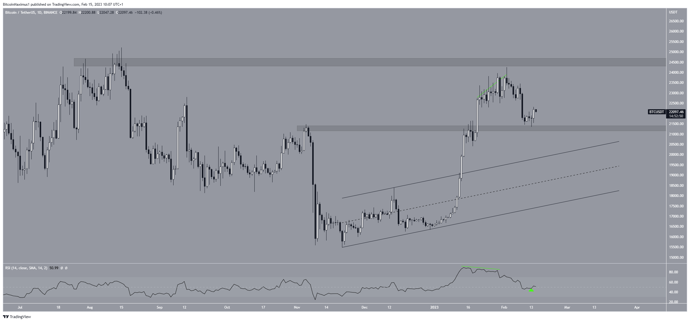 Дневной таймфрейм дает более неоднозначное представление. Хотя биткоин и вырвался из восходящего параллельного канала, к концу января он потерял импульс — а RSI сформировал медвежью дивергенцию.