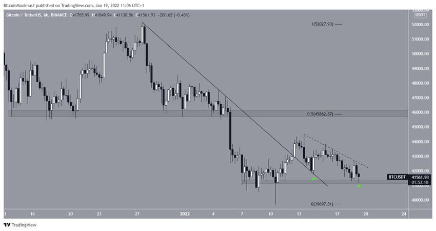 Начиная с 8 января биткоин торговался над областью $41 500. Хотя 19 января BTC просел к минимуму на $39 650, цена сразу же совершила отскок и сформировала очень длинный нижний фитиль, что считается признаком давления со стороны покупателей.