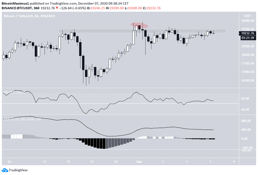 Впрочем, более короткие таймфреймы обрисовывают более оптимистичную картину. На 6-часовом графике биткоин торгуется сейчас внутри области сопротивления $19 400, уже четвертый раз пытаясь прорваться выше нее.