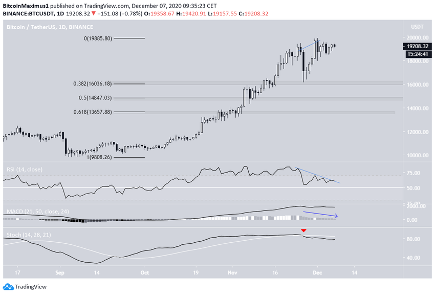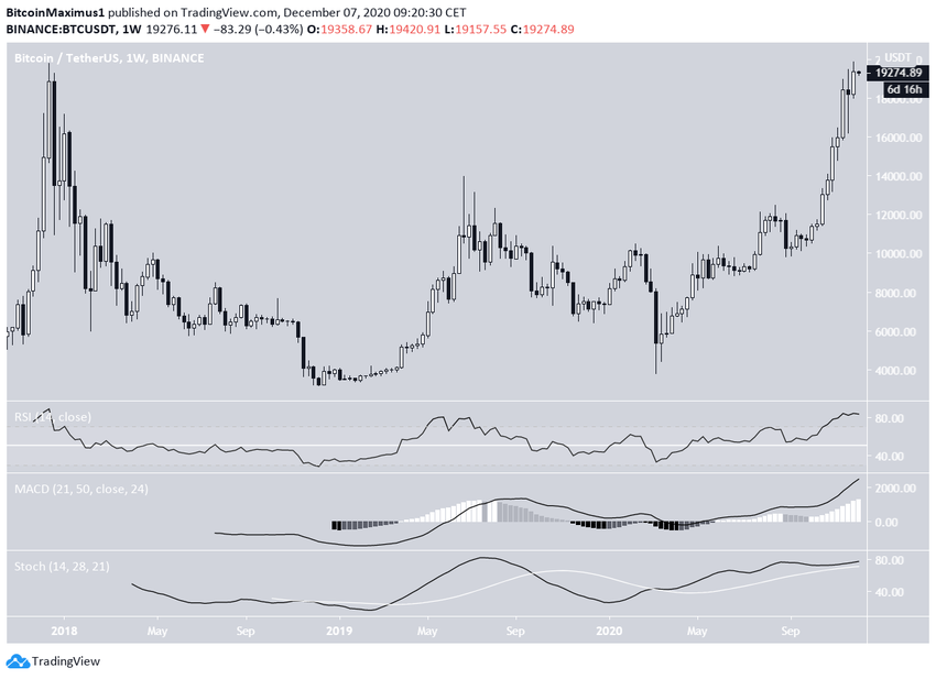 По итогам недели с 1 по 7 декабря курс биткоина (BTC) сформировал небольшую бычью свечу. В моменте цена успела обновить 1 декабря исторический максимум на $19 888, после чего откатилась. Эта свеча появилась на графике вслед за свечой Доджи от предыдущей недели, и поэтому ее можно расценивать как признак укрепления после периода нерешительности.