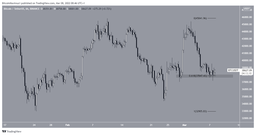 На 6-часовом графике биткоин дважды отскочил от поддержки, представленной уровнем Фибо 0.618 коррекции в районе $37 800.