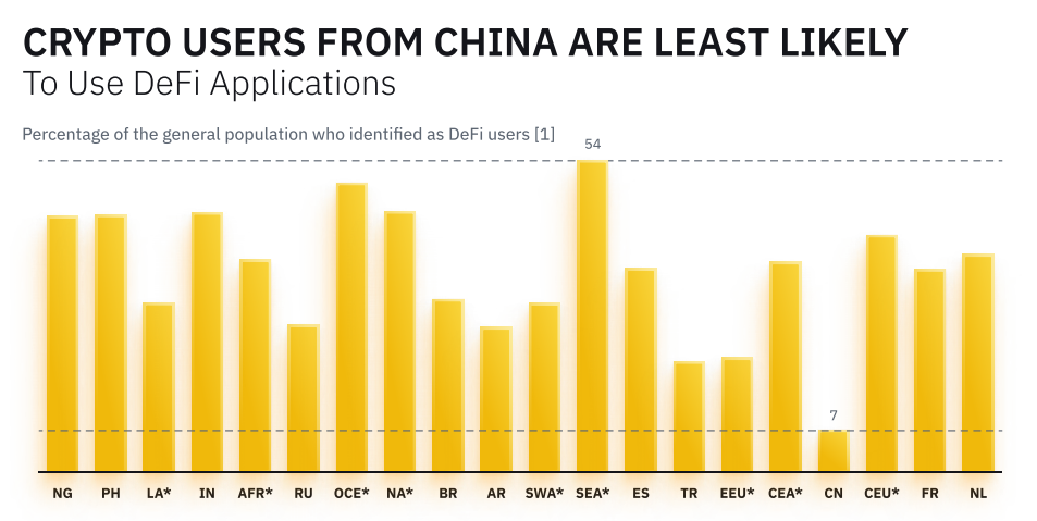 Sponsored Sponsored● DeFi набирает скорость. 66% всех пользователей заявили, что используют приложения DeFi. DeFi наиболее популярен в Юго-Восточной Азии, где более 54% опрошенных пользователей используют dApps.