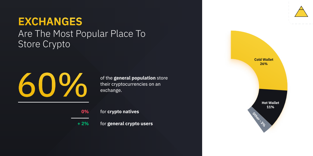 ● Биржи — самое популярное место для хранения криптовалют: 60% пользователей хранят свои цифровые активы на биржах. В качестве наиболее важных факторов при выборе биржи пользователи называют безопасность (28%), за ней следуют UI/UX (25%) и доступные торговые пары (23%).