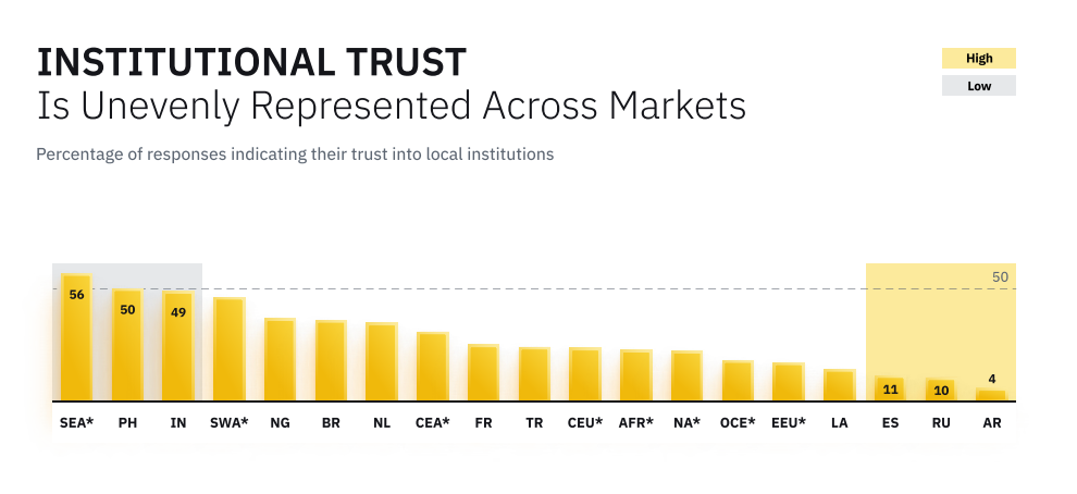 ● Пользователи верят в свободу денег. Снижение доверия к финансовым институтам коррелирует с растущим доверием к криптовалютам: На 17 из 20 представленных рынков менее 50% респондентов сообщили, что доверяют местным институтам.