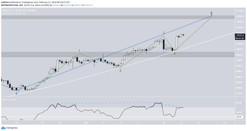 11 февраля биткоин отскочил от параболической линии восходящей поддержки и вырос внутри дня на 6%.Вероятно, цена находится внутри пятой волны модели Эллиотта.