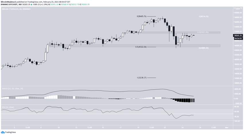 Сейчас BTC торгуется в диапазоне между упомянутой поддержкой $45 300 и уровнем Фибо 0.5 коррекции предыдущего снижения на $51 600 (белый цвет).