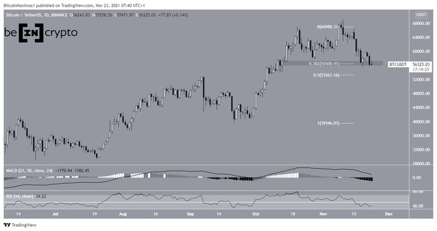 На дневном графике биткоин продолжает удерживаться над горизонтальной поддержкой $56 500. Она представлена уровнем Фибо 0.382 коррекции и горизонтальной областью. 19 ноября курс BTC отскочил от этой области, но сейчас снова тестирует ее.