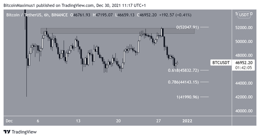 На 6-часовом графике биткоин торгуется непосредственно над уровнем Фибо 0.618 коррекции на $45 850. В этой же области располагаются минимумы 13-20 декабря.