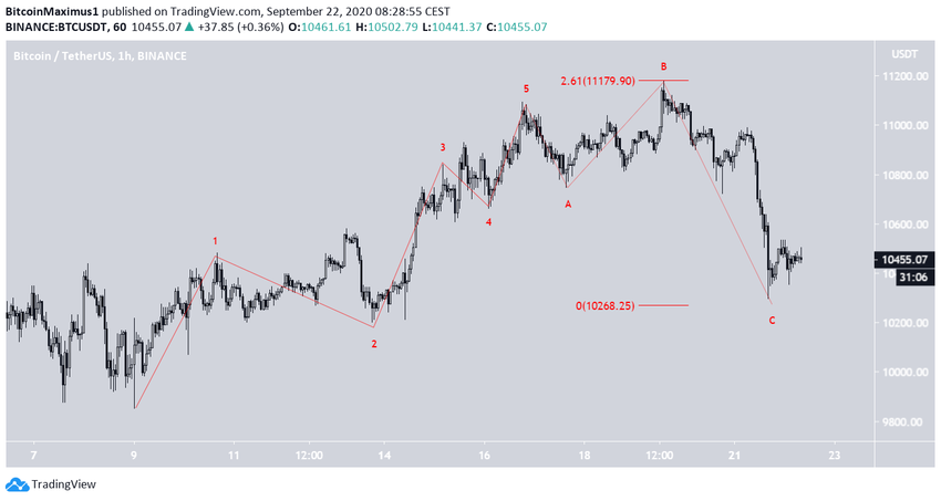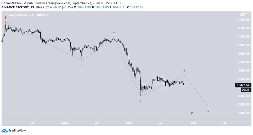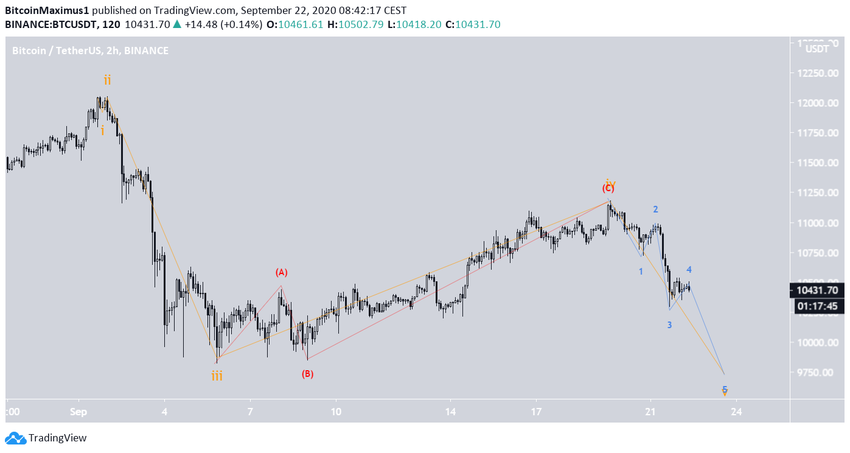 Форма паттерна A-B-C выглядит нетрадиционно, однако соотношение волн A:C составляет 1:2.61, а значит, фигура корректна. Однако для завершения волны С биткоин в скором времени должен достичь минимума.