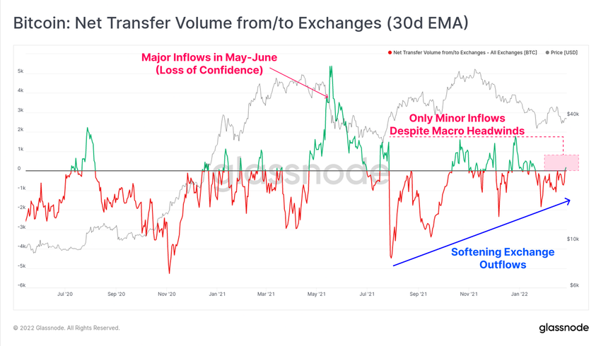 SponsoredТакже эксперты взглянули на приток криптовалюты. Как видно на графике ниже, рынок все еще не зафиксировал приток, близкий к тому, что был во время падения в мае-июле 2021 года. Текущий рынок, похоже, не потерял доверия к биткоину как к макроактиву, полагают в Glassnode.