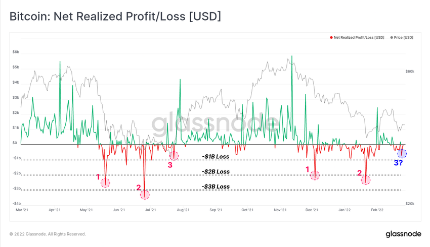 За прошедшую неделю продажи на рынке оказались сопоставимы с показателями июля 2021 года. По итогам закрытия февраля чистые реализованные убытки составили $713 млн. По мнению Glassnode, главным триггером для распродажи биткоина может стать угроза развязывания кинетической войны*.