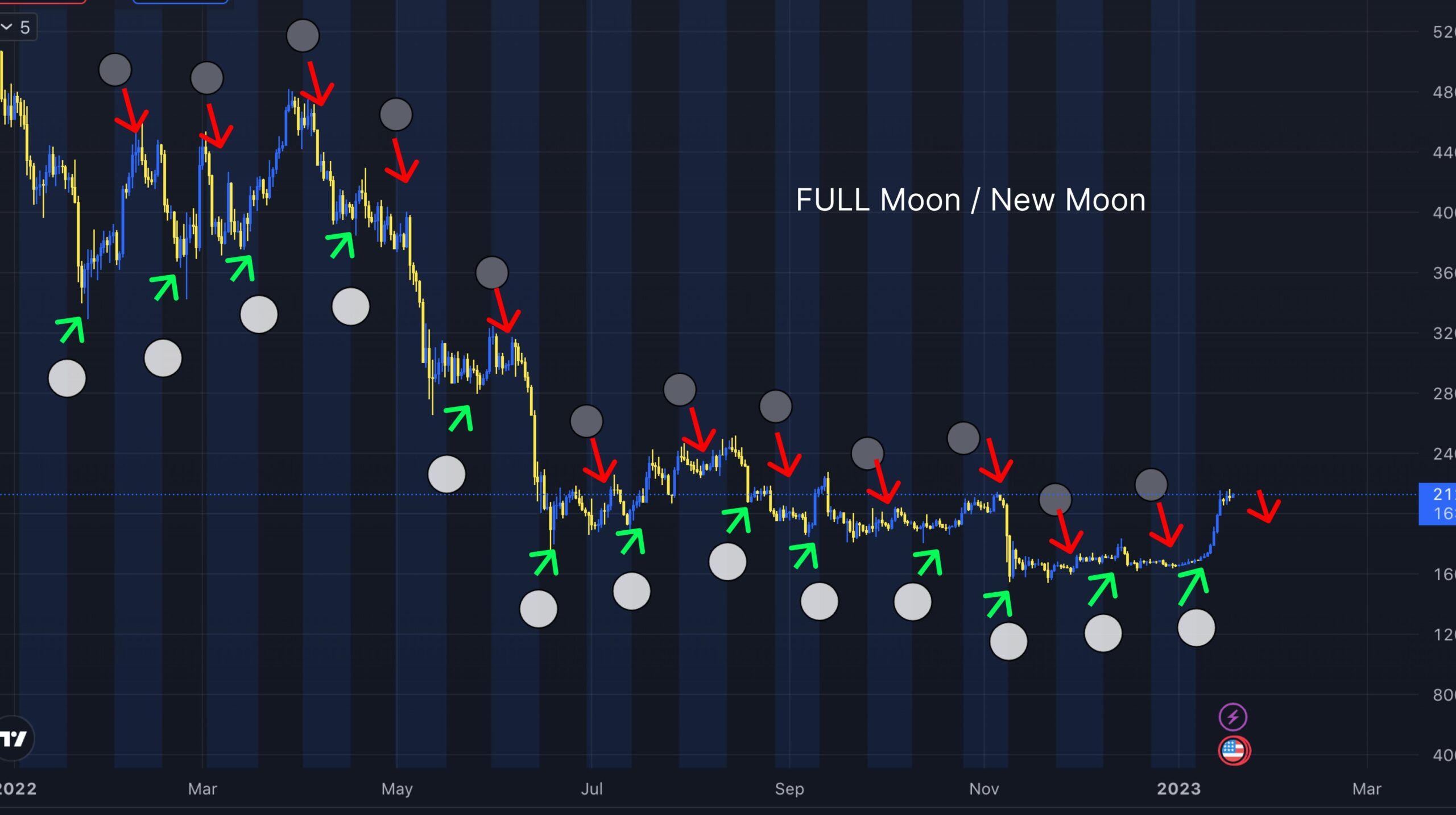 В 2023 году во многих Телеграм-каналах, «Твиттере» и других социальных сетях одни за другими начали появляться прогнозы биткоина на базе лунного календаря. Выглядят они, в большинстве своем, примерно, вот так: