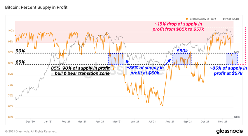 Падение цены биткоина до $57 000 создало угрозу для дальнейшего «рефлексивного» снижения. К такому выводу пришли в Glassnode. Аналитики выяснили, что при таком курсе около 85% BTC находится в прибыли. Остальные 15% от предложения несут убытки.