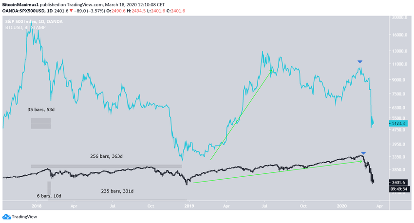 Сравнение поведения биткоина и S&P 500 показывает наличие положительной корреляции как минимум с начала 2018 года – незадолго до этого цифровая валюта отметилась на рекордных максимумах. Впоследствии котировки пошли на снижение, которое завершилось 5 февраля 2018 года. Однако биткоин начал дешеветь на 35 дней раньше американского индекса. Общее снижение продолжилось 300 дней и в обоих случаях завершилось в декабре того же года.