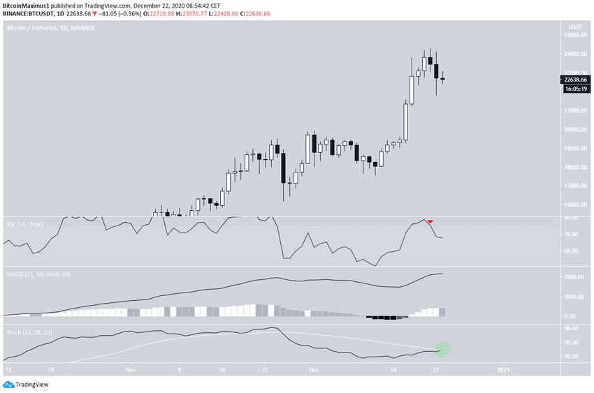 Вчера BTC провалился от максимумов выше $24 000 и протестировал область $21 815. На графиках сформировалась свеча с длинными тенями, что указывает на высокую степень рыночной неопределенности на данном этапе.