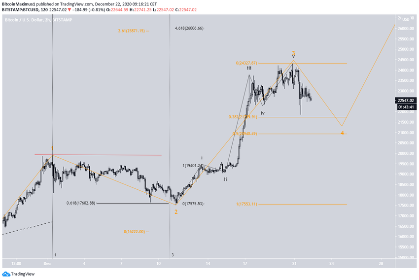 Падение под отметку $19 918 (красная линия) нивелирует этот подсчет волн.