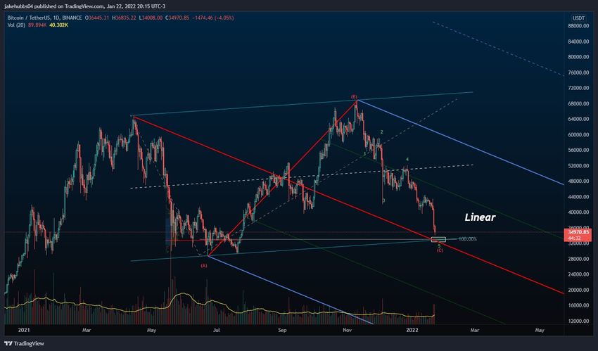 Формирование минимума в области $33 300 даст нам соотношение волн A:C как 1:1 (красный цвет). Это также совпадет с линией поддержки восходящего параллельного канала, который сдерживает цену с апреля.