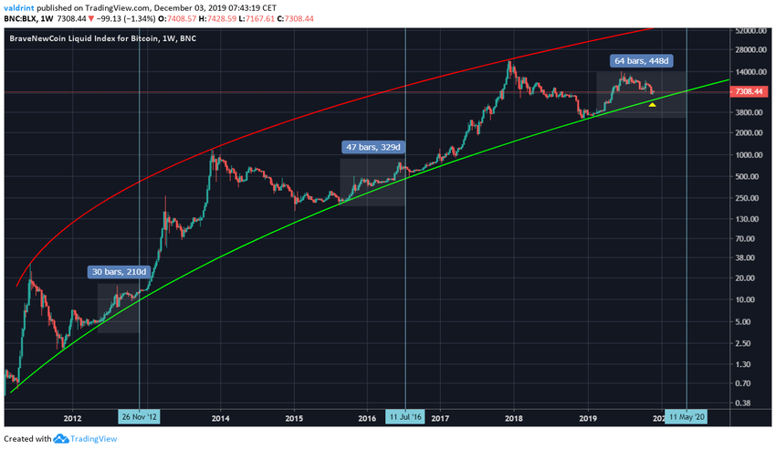 Если BTC продолжит аналогичный ход, то будет постепенно подниматься вплоть до ближайшего халвинга, намеченного на май 2020 года. Также, поскольку линия поддержки на данный момент проходит ниже текущей цены, не исключена новая волна снижения перед возобновлением полноценного роста.