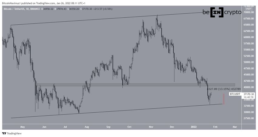 Биткоин с апреля 2021 года торгуется внутри восходящего параллельного канала. 24 января 2022 года курс BTC достиг минимума на $32 917, а затем отскочил от него. В результате рынок проверил на прочность линию поддержки этого канала, а коин вырос после отскока на 13%.