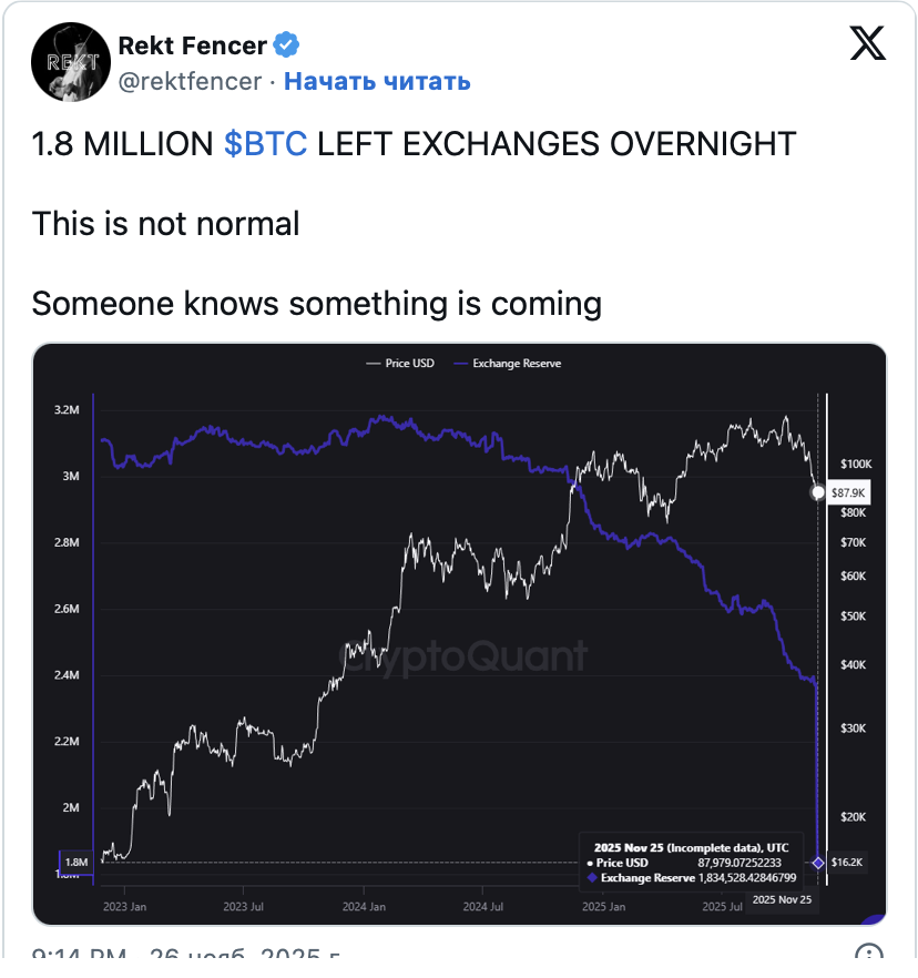 Биржевые резервы сократились до 1,83 млн BTC, что существенно ниже предыдущих уровней. Традиционно снижение доступного предложения на торговых площадках рассматривается как позитивный сигнал. Это предполагает перемещение монет на долгосрочное хранение.